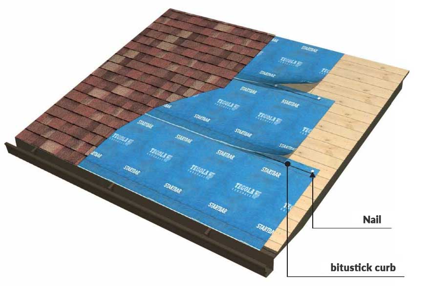 - - Nakłada się równolegle do okapu i przybija gwoździami pod zakładką. Przez ograniczony okres czasu jest w stanie wytrzymać działanie czynników atmosferycznych, w oczekiwaniu na ostateczne pokrycie.