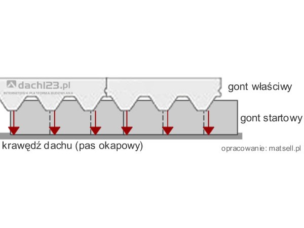 Ze względu na wycięcia wzorów w goncie właściwym, pierwszą warstwę gontu bitumicznego należy montować na gont startowy w kolorze gontu właściwego.
